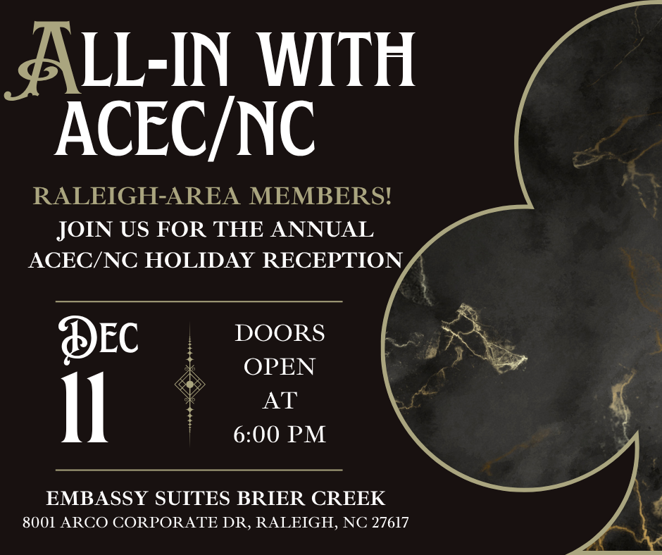 ACEC/NC has reserved a room block at the Embassy Suites by Hilton Raleigh Durham Airport Brier Creek for December 11, 2025 through December 12, 2025. To book your room at the discounted group rate of $204/night, click the button below and follow the instructions on the Hotel's website.